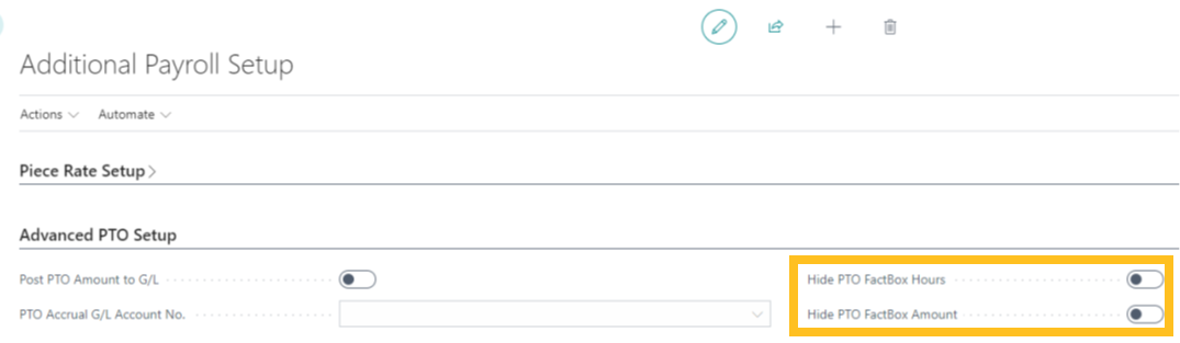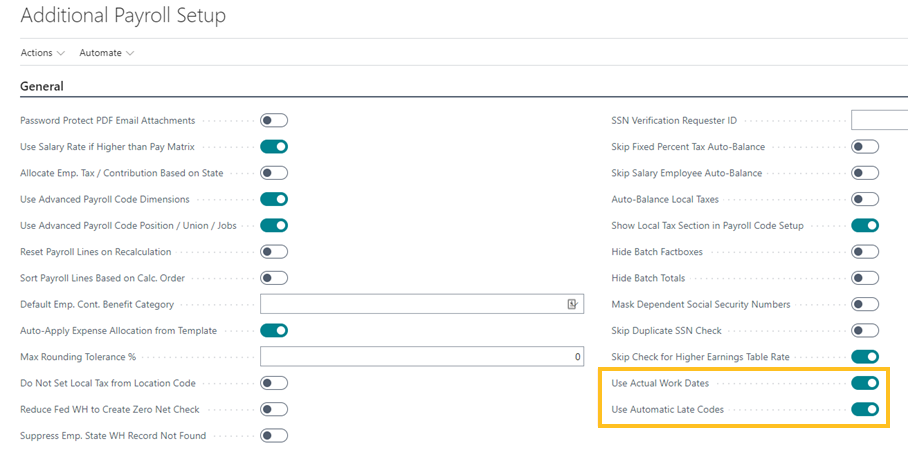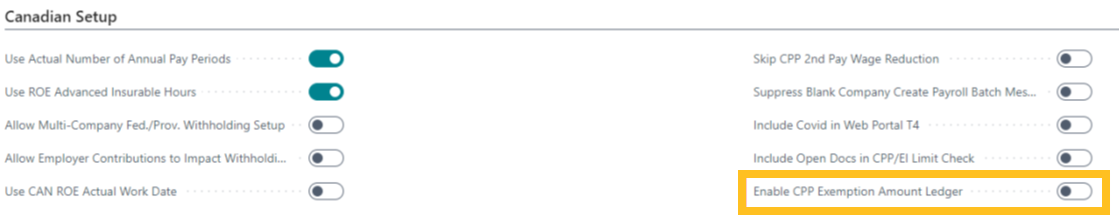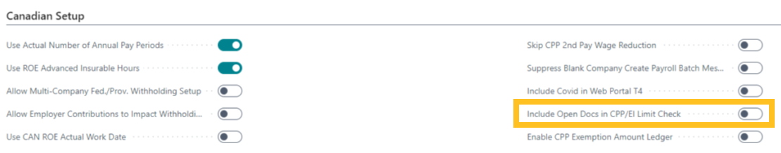 Sur l' Configuration supplémentaire de la paie , sur le raccourci Configuration canadienne raccourci, cette version ajoute le Inclure les documents ouverts dans la vérification de la limite RPC/AE champ. Lorsque ce champ est activé, les montants RPC ou AE des documents de paie ouverts sont inclus dans les écritures du registre de paie