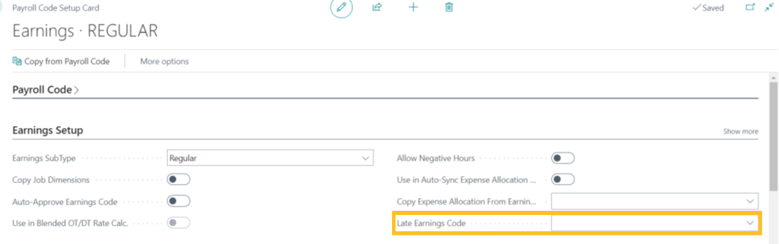 Si dans le Configuration supplémentaire de la paie , les informations Utiliser les codes de retard automatiques est activé, le Code de gains pour retard le champ devient disponible dans les gains Fiche de configuration des codes de paie pages. Vous pouvez utiliser le Code de gains pour retard champ pour lier le code de gains pour retard au code de gains nécessaire. Lorsque le Code de gains pour retard champ est renseigné, si le cycle de paie est fermé, ce code de gains est utilisé lorsque les enregistrements sont renseignés dans Détail des heures.