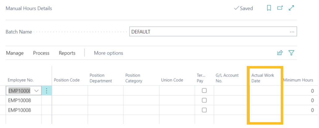 Lorsque sur la Configuration supplémentaire de la paie , les informations Utiliser les dates de travail réelles est activé, le Date de travail réelle le champ devient disponible dans le Détails des heures manuelles .