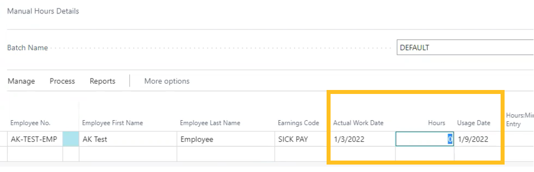 Dans cette capture d'écran, vous pouvez voir comment le Date d'utilisation champ renseigne automatiquement la première date disponible dans le prochain cycle de paie ouvert même si le Date de travail réelle provient du cycle de paie précédent ou fermé.