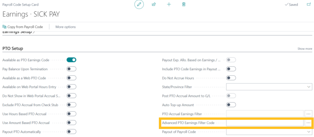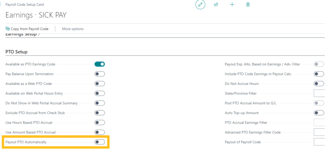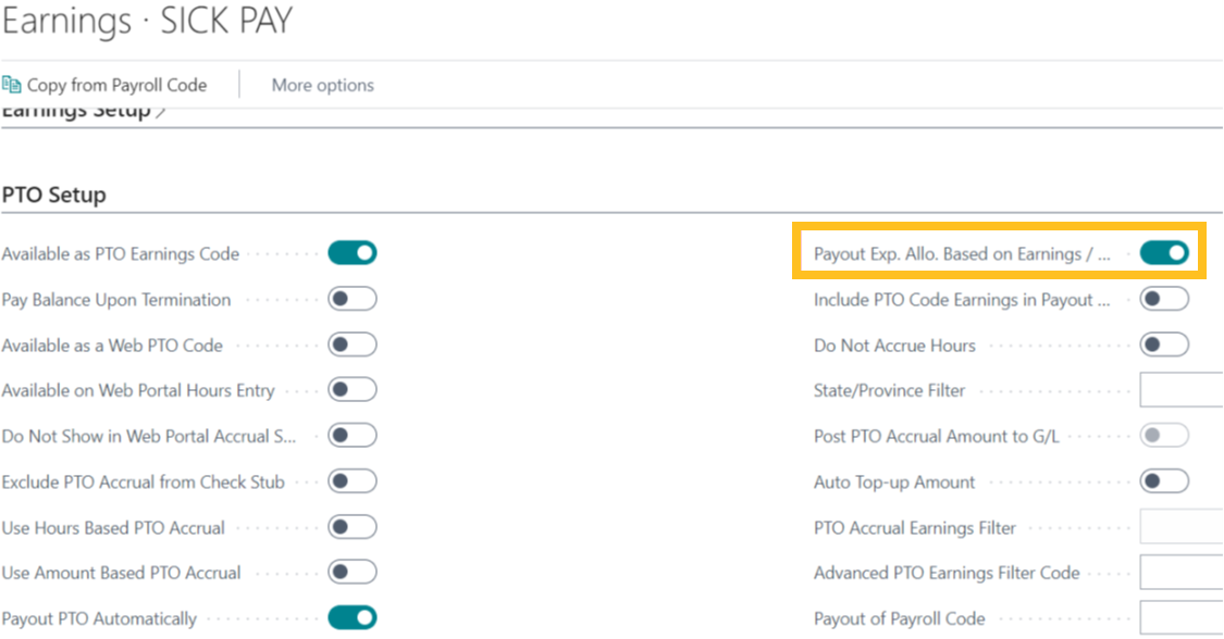 Pour activer Affectation des dépenses de paie basée sur les gains / filtre avancé, sur l' Fiche de configuration des codes de paie , les informations Payer automatiquement les CPT de paie doit être activé.