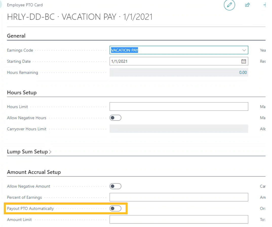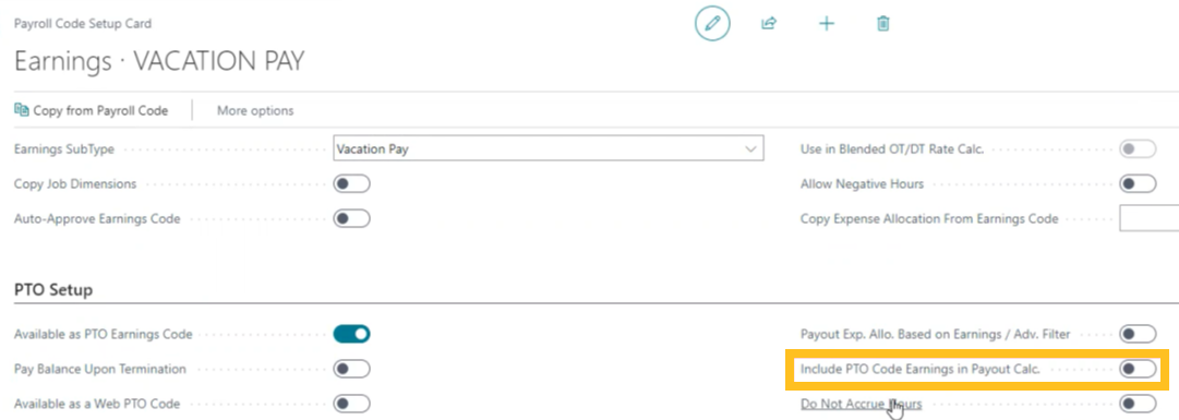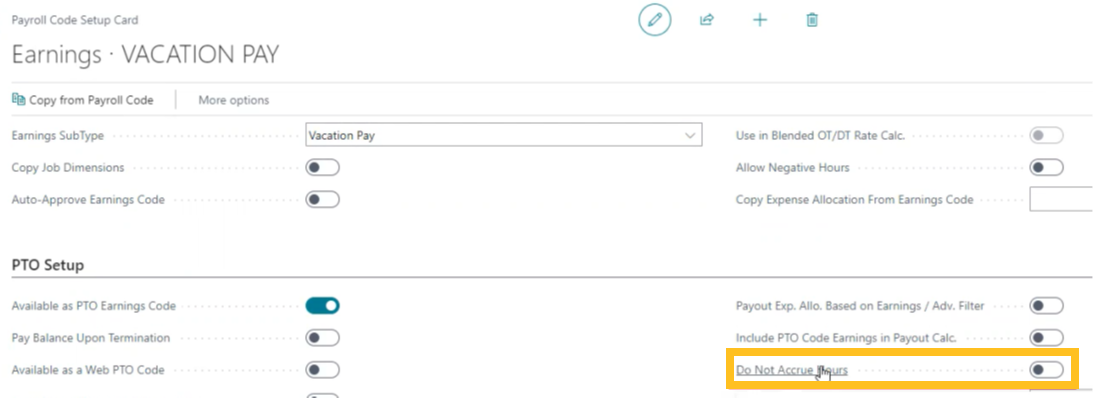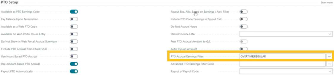 Sur l' Fiche de configuration des codes de paie page, si le code de gains CPT est une accumulation basée sur les montants, et Ne pas accumuler d'heures est activé, le calcul ignore l'accumulation des heures et n'accumule que des dollars.