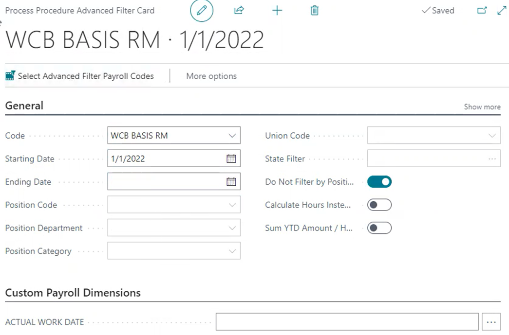 Sur l' Fiche de filtre avancé de procédure de calcul page, vous pouvez définir les codes de paie actifs pour le filtre avec d'autres codes, tels que les codes de poste et les codes syndicaux.