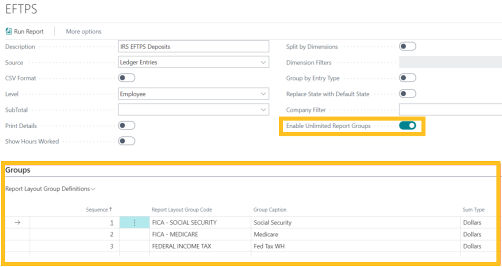Sur l' Disposition du rapport de paie page, lorsque Activer les groupes de rapports illimités est activé, un utilisateur peut créer autant de groupes de rapports que nécessaire. Aussi, lorsque Activer les groupes de rapports illimités est activé, le rapport n'est pas limité à 8 groupements et le type de groupement peut être spécifié, par exemple,