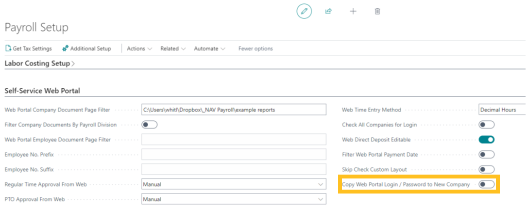 Sur l' Configuration de paie page, lorsque Copier le login / mot de passe du portail web dans une nouvelle compagnie est activé, les logins et mots de passe du portail en libre-service des employés sont copiés dans la nouvelle compagnie lors de la création d'une compagnie