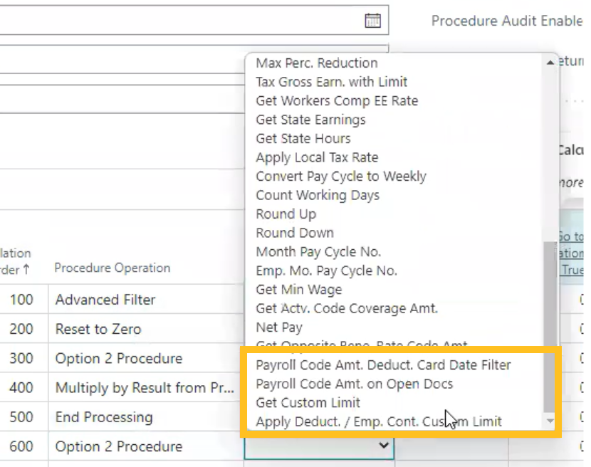 Sur l' En-tête de la procédure de calcul page, lorsque Opération de procédure est défini sur Procédure option 2, dans Opération de procédure 2, cette version introduit de nouvelles options.