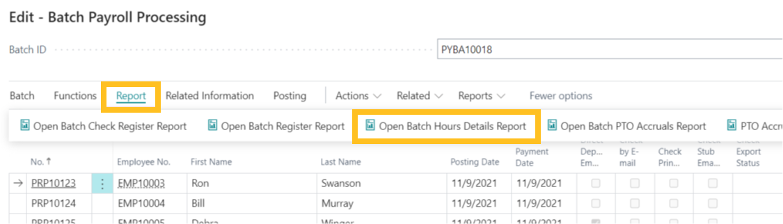 La Ouvrir le rapport de détail des heures du lot affiche les heures dans un lot.
