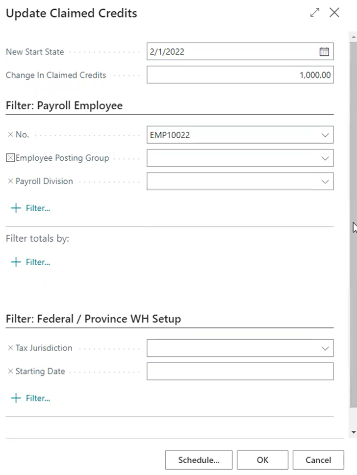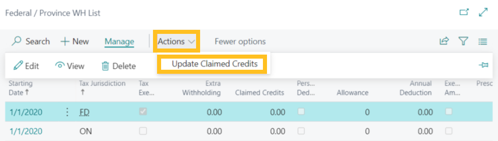 Si un ou plusieurs employés ont un montant de crédit réclamé différent de zéro, pour mettre à jour le montant de crédit réclamé par date d'effet Mettre à jour les crédits réclamés. Si un ou plusieurs employés ont un crédit réclamé de zéro, cette action n'effectue aucune mise à jour car les tables fiscales