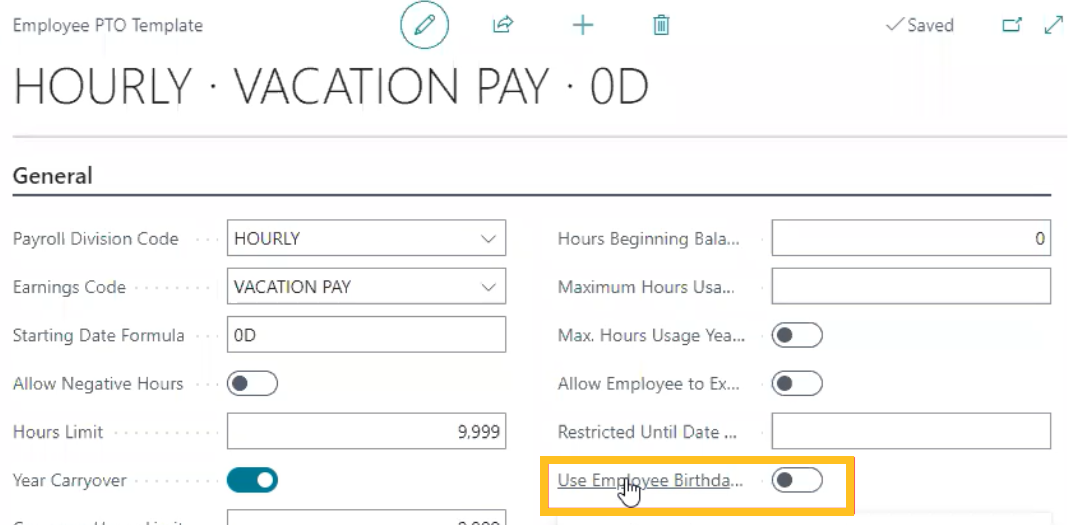 Sur l' Modèle CPT des employés page, lorsque Utiliser la date d'anniversaire de naissance de l'employé comme date de début/d'anniversaire est activé, la date d'anniversaire de naissance de l'employé est utilisée comme date de début et date d'anniversaire dans la fiche CPT.