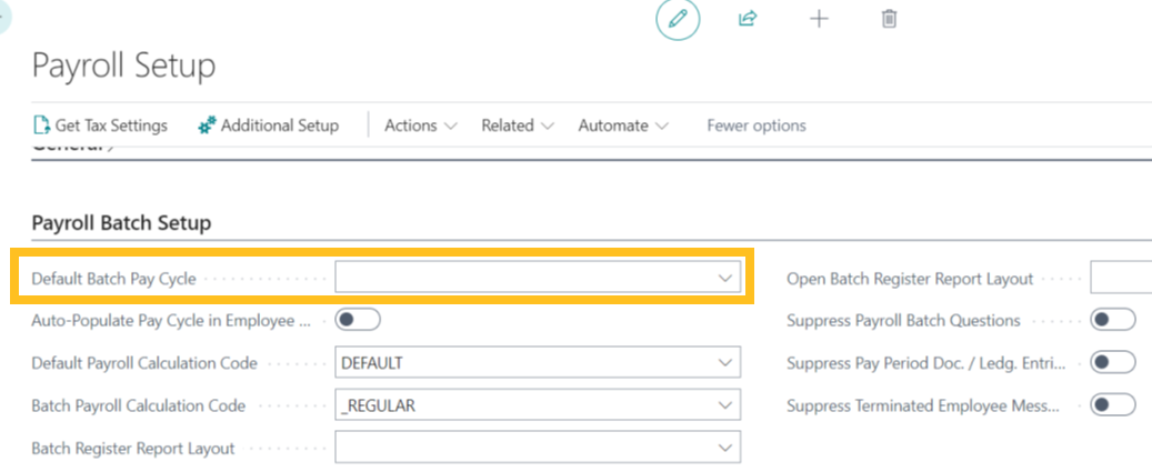 À partir de cette version, lorsque dans le Configuration de paie page, il existe une valeur spécifiée pour Cycle de paie par défaut du lot, le cycle de paie dans la fiche de salaire est automatiquement renseigné avec le cycle de paie par défaut du lot.