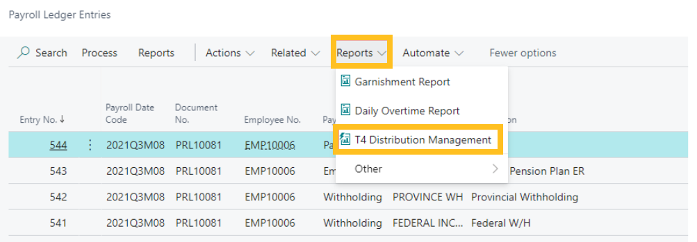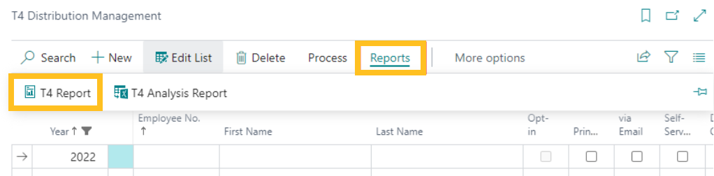 Sélectionnez l'enregistrement pour lequel vous souhaitez accéder à un rapport T4, puis dans la barre d'actions, choisissez Rapports > Gestion de distribution T4.