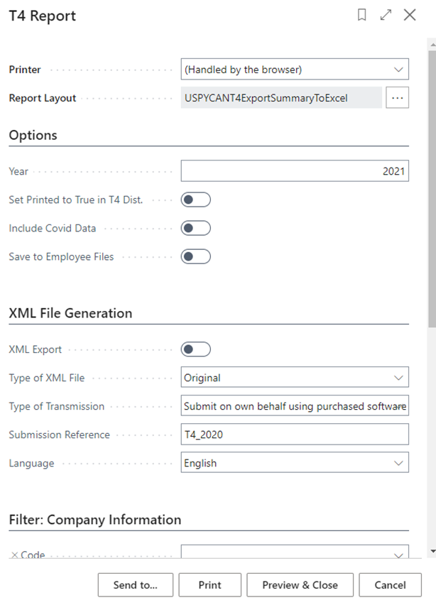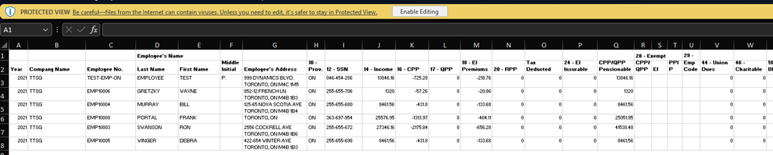 Pour afficher la sortie du rapport T4, choisissez Envoyer vers > Document Microsoft Excel (données et disposition).