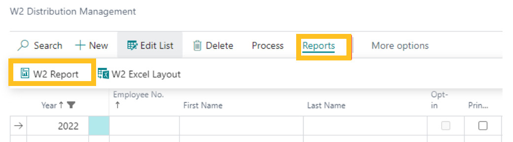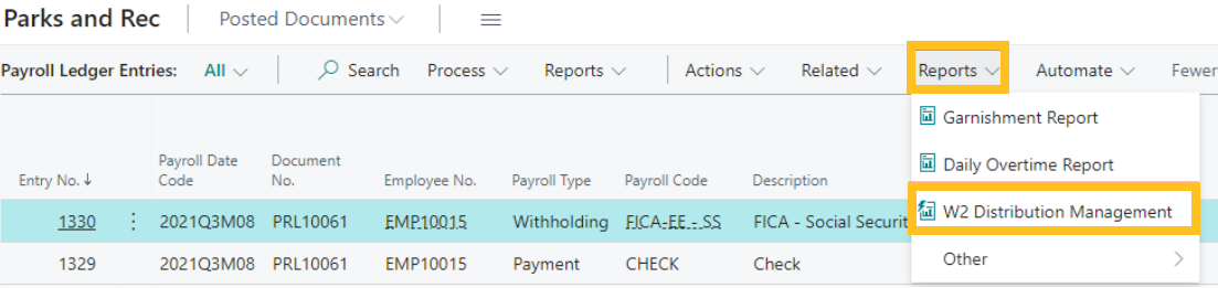 Sélectionnez l'enregistrement pour lequel vous souhaitez accéder à un rapport W2, puis dans la barre d'actions, choisissez Rapports > Gestion de la distribution W2.