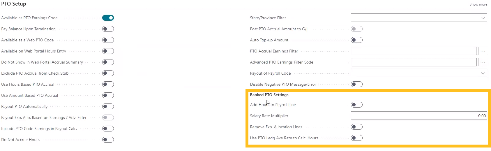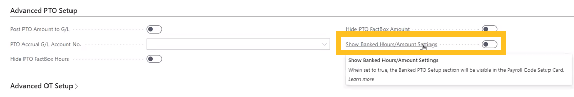 Sur l' Configuration supplémentaire de la paie , sur le raccourci Configuration avancée des CPT raccourci, il y a un nouveau Afficher les paramètres des heures/montants bancaires champ. Lorsque Afficher les paramètres des heures/montants bancaires est activé, le Paramètres CPT bancaires la section est visible dans le Fiche de configuration des codes de paie , sur le raccourci Configuration des CPT Raccourci.