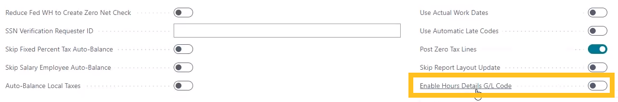 Sur l' Configuration supplémentaire de la paie , sur le raccourci Général raccourci, il y a un nouveau Activer le code G/L pour les détails des heures champ.
