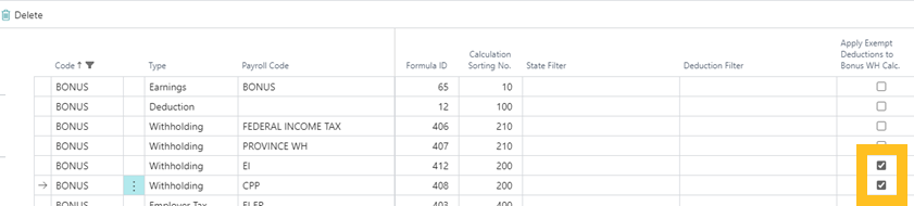 Pour le Canada seulement, dans le Lignes de calcul de paie page, il y a un nouveau Appliquer les déductions exonérées au calcul de la retenue sur les primes case à cocher. Lorsque Appliquer les déductions exonérées au calcul de la retenue sur les primes est sélectionné, les déductions exonérées d'impôt sont appliquées aux gains applicables des calculs de primes.