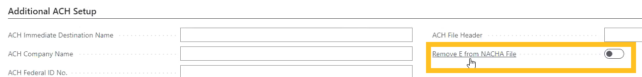 Sur l' Configuration supplémentaire de la paie , sur le raccourci Configuration ACH supplémentaire raccourci, il y a un nouveau Supprimer le E du fichier NACHA champ.