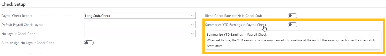 Sur l' Configuration de paie , sur le raccourci Configuration du chèque raccourci, il y a un nouveau Totaliser les gains depuis le début de l'année dans le chèque de paie champ.