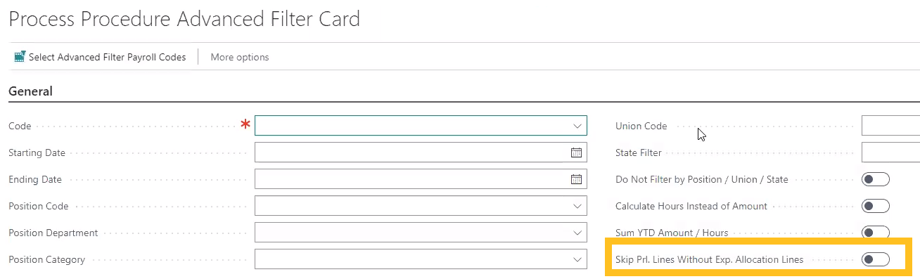 Sur l' Fiche de filtre avancé de procédure de calcul page, il y a un nouveau Ignorer les lignes de paie sans lignes d'affectation des dépenses champ.