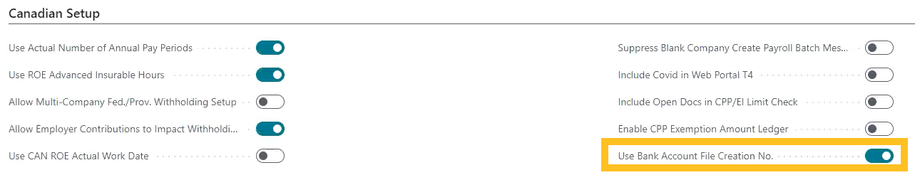 Sur l' Configuration supplémentaire de la paie , sur le raccourci Configuration canadienne raccourci, il y a un Utiliser le numéro de création de fichier du compte bancaire champ.