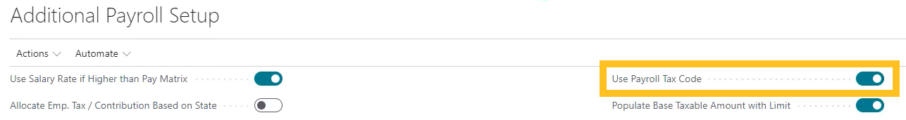 Sur l' Configuration supplémentaire de la paie , sur le raccourci Général raccourci, il y a un nouveau Utiliser le code de taxe de paie champ.