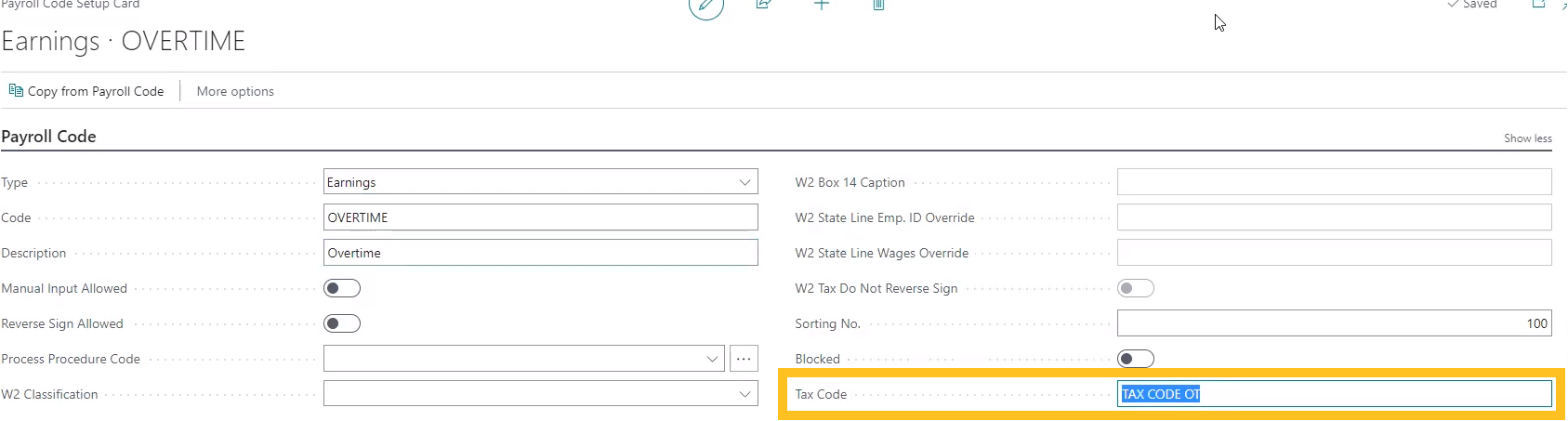 Lorsque Utiliser le code de taxe de paie est activé, dans le Fiche de configuration des codes de paie page, un Code de taxe champ apparaît. Sparkrock Impact renseigne le code fiscal spécifié dans Code de taxe champ dans le registre de paie.