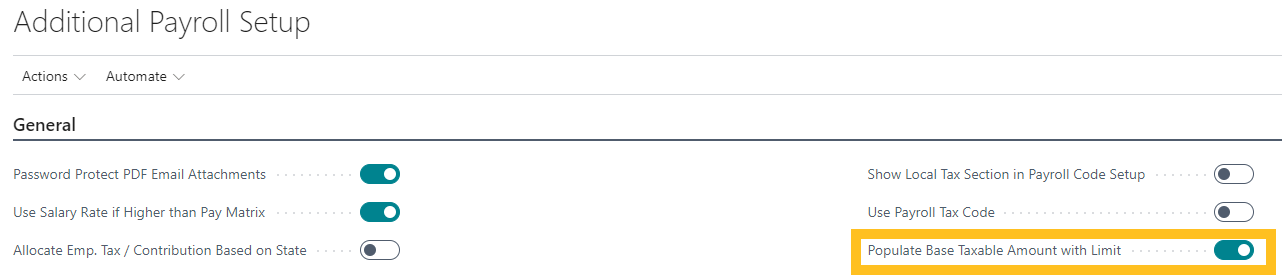 Sur l' Configuration supplémentaire de la paie page, lorsque Montant de base imposable renseigné avec limite est activé, dans le Écritures du grand livre de paie page, il y a un nouveau Montant de base imposable avec limite champ. Lorsque Montant de base imposable renseigné avec limite est activé, Sparkrock Impact renseigne automatiquement Montant de base imposable avec limite champ.