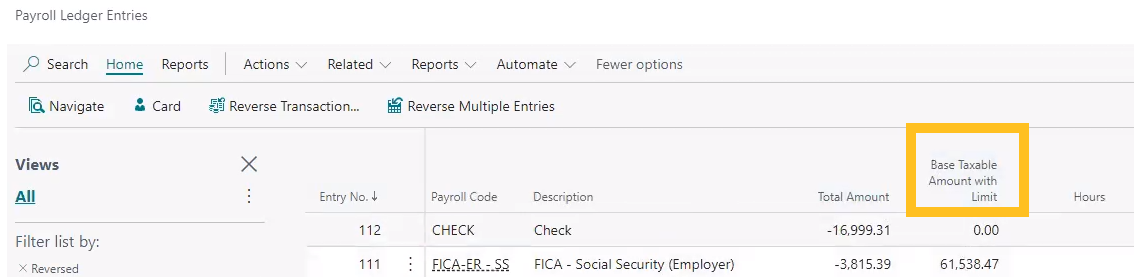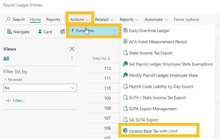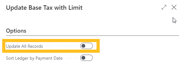 Pour renseigner les données dans le Montant de base imposable avec limite champ depuis le début de l'année, dans la barre d'actions, choisissez Actions > Fonctions > Mettre à jour la base fiscale avec la limite, activez Mettre à jour tous les enregistrements, puis choisissez OK.