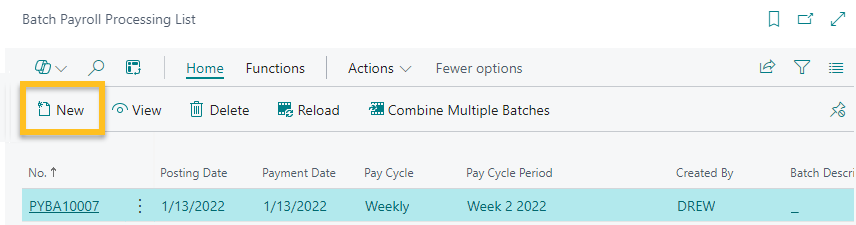 Sur l' Liste de traitement des lots de paie page, cette version corrige l'affichage du Nouveau action. Une modification de Microsoft Business Central dans la dernière mise à jour avait changé l'emplacement de l'action.