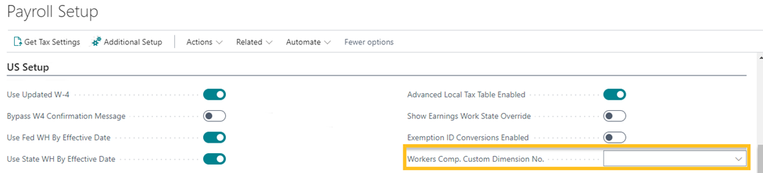Sur l' Configuration de paie , sur le raccourci Configuration États-Unis raccourci, cette version introduit un N° de dimension personnalisée pour accidents du travail champ.