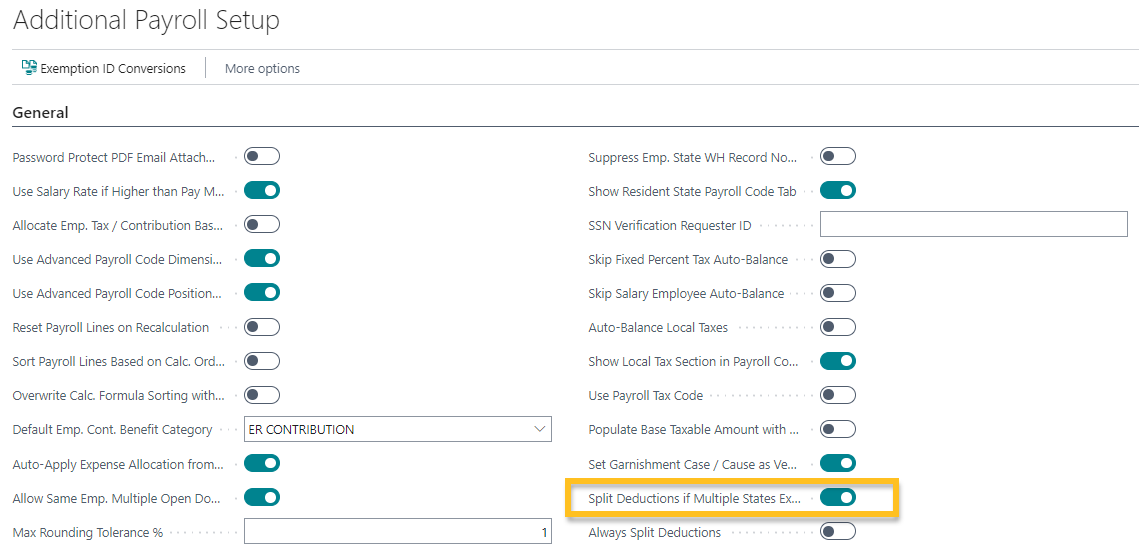 Sur l' Configuration supplémentaire de la paie page, cette version introduit un Répartir les déductions si plusieurs États existent champ.