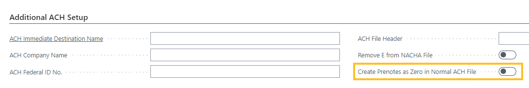 Sur l' Configuration supplémentaire de la paie , sur le raccourci Configuration ACH supplémentaire raccourci, cette version introduit un Créer les prénotes à zéro dans le fichier ACH normal champ.
