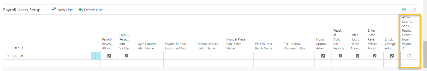 Sur l' Configuration de paie , sur le raccourci Configuration des utilisateurs de paie raccourci, cette version introduit un Autoriser l'utilisateur à voir les enregistrements GL générés depuis la paie champ.