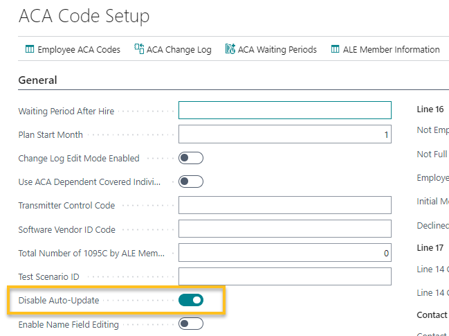 Si vous n'utilisez pas la paie pour déclarer l'ACA, il est recommandé d'activer Désactiver la mise à jour automatique. L'intention de cette fonctionnalité est d'améliorer les performances pour les compagnies canadiennes qui ne déclarent pas l'ACA.