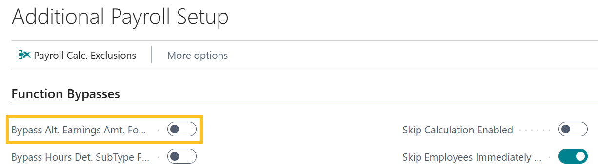 Champs supplémentaires ajoutés au raccourci Contournements de fonctions dans la page de configuration supplémentaire de la paie