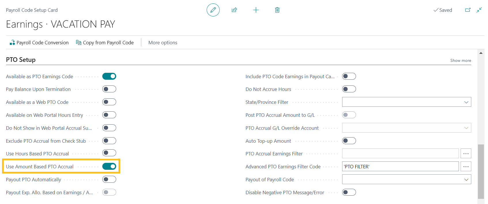 Sur l' Fiche de configuration des codes de paie page, cette version introduit le Utiliser l'accumulation CPT basée sur les montants champ.