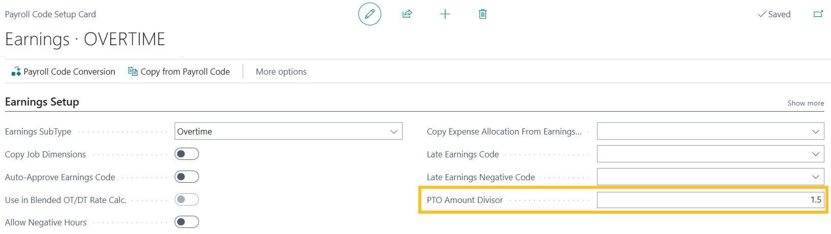 Lorsque la page Utiliser l'accumulation CPT basée sur les montants champ est activé, et le Diviseur du montant CPT est défini sur une valeur autre qu'un ou zéro, Sparkrock Impact divise les gains du code de paie respectif par la valeur spécifiée avant de calculer le montant d'accumulation PTO. Cette fonctionnalité ne s'applique pas aux accumulations de montants PTO calculées à l'aide d'un filtre avancé.
