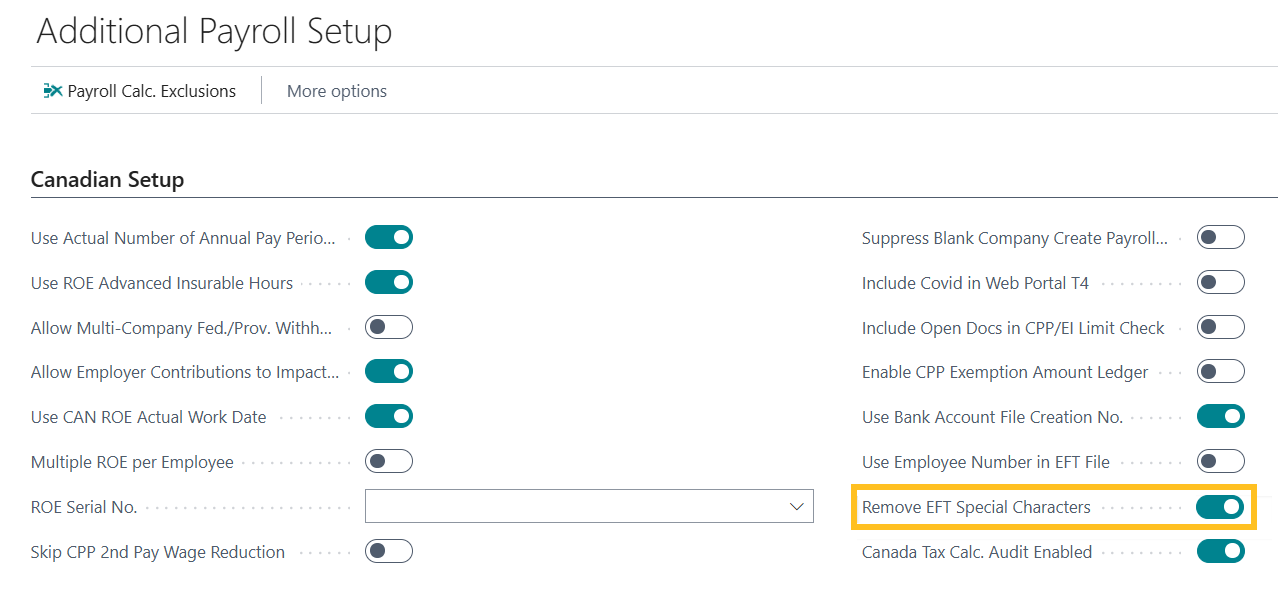 Pour les clients canadiens, lorsque Supprimer les caractères spéciaux TEF est activé, les caractères spéciaux sont maintenant supprimés du nom et des numéros d'employé dans le transfert électronique de fonds