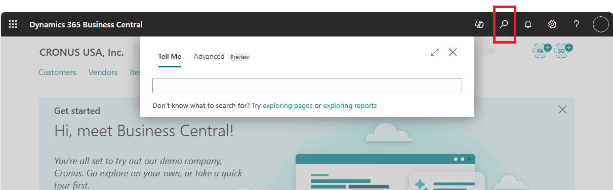 Utilisez la fonctionnalité Tell Me pour rechercher des données dans tout Business Central. Par exemple, vous pouvez trouver un client en saisissant son nom ou son adresse, ou même trouver un enregistrement spécifique, comme une commande vente. Vous pouvez également l'utiliser pour trouver des informations dans notre documentation.